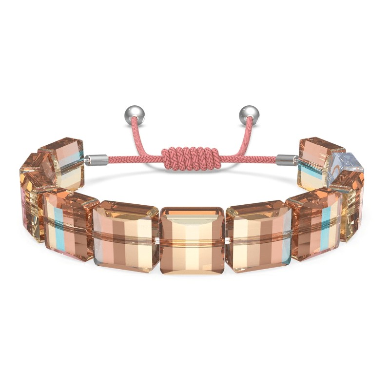 Bracciale della collezione Letra di Swarovski, realizzato con cristalli rosa taglio square e rifinito con un cordino regolabile in cotone cerato. Su di uno dei cristalli è presente un fiore di loto stampato.